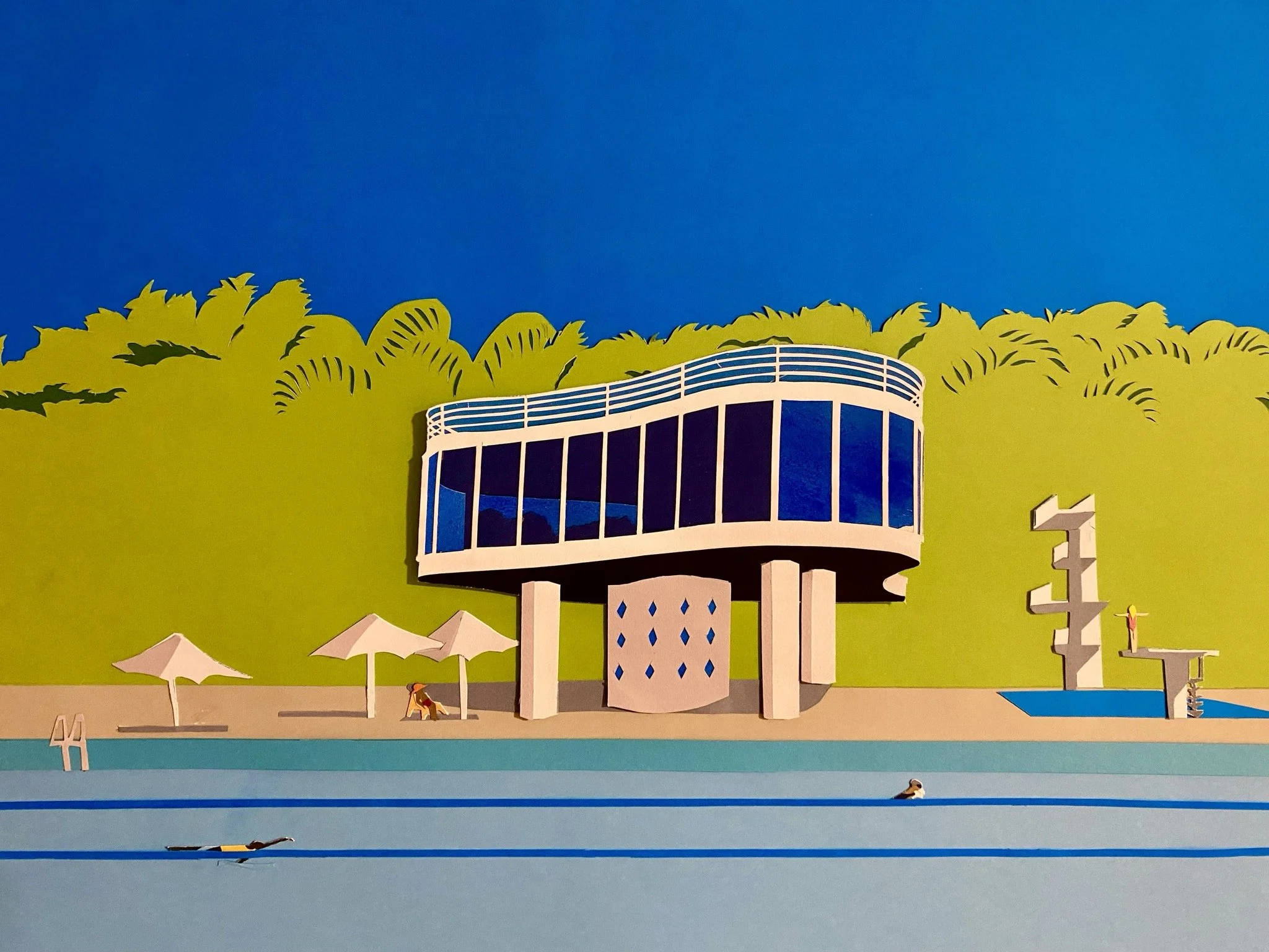 “Centenary Pool, designed by Jim Birrell, opened in 1959. He believed good buildings integrated into the contours of the landscape and were an extension of their environment. The sculptural curves of the building are set into the lush backdrop of Victoria Park. As an avid swimmer and an artist, I have celebrated this building in many different forms. The conceptual sketch for the Brisbane 2032 Olympics show this modest building subsumed into a monolithic aquatic centre that seems to divorce it from both Victoria Park and the subtropical vegetation that surrounds the pool.”