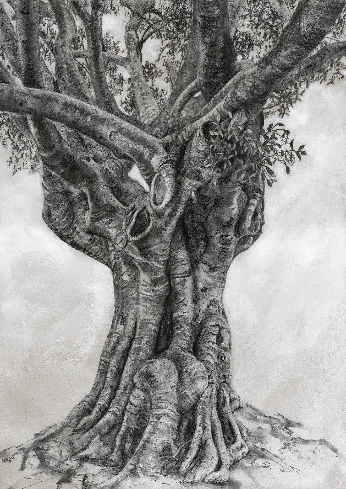 “This detailed drawing of an ancient Fig tree represents cupped hands opening to the sky and the elements. It indicates the interconnectedness of all aspects of life, the tree, human hands, the earth itself. It reminds us that we are the custodians and caretakers of the natural spaces around us. If we look closely into the textures of the bark, we can see ourselves reflected, with both our battle scars and new possibilities.“
