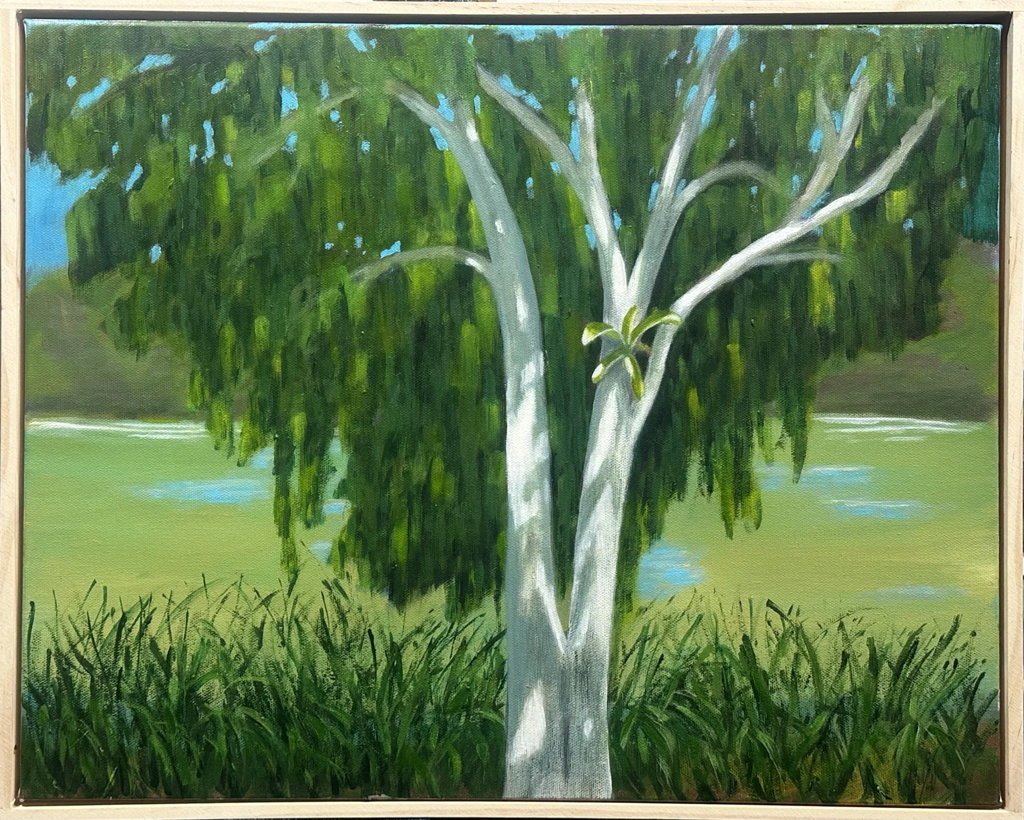 “This painting centres on a single tree, its pale trunk illuminated against a veil of green, standing quietly within the soft wetlands of Victoria Park. The work draws attention to a moment of pause - where light, water, and foliage settle into balance, offering a sense of calm within an urban landscape. It becomes a reflection on care and continuity, inviting us to notice and protect the quiet spaces that sustain both place and spirit.”