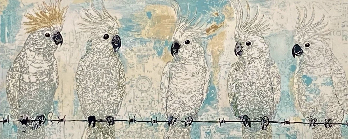 I chose the sulphur-crested cockatoo as the subject of these works because they are a familiar presence, both here and in my own experience growing up. They are intelligent, noisy, and deeply connected to place... part of the life of Country.