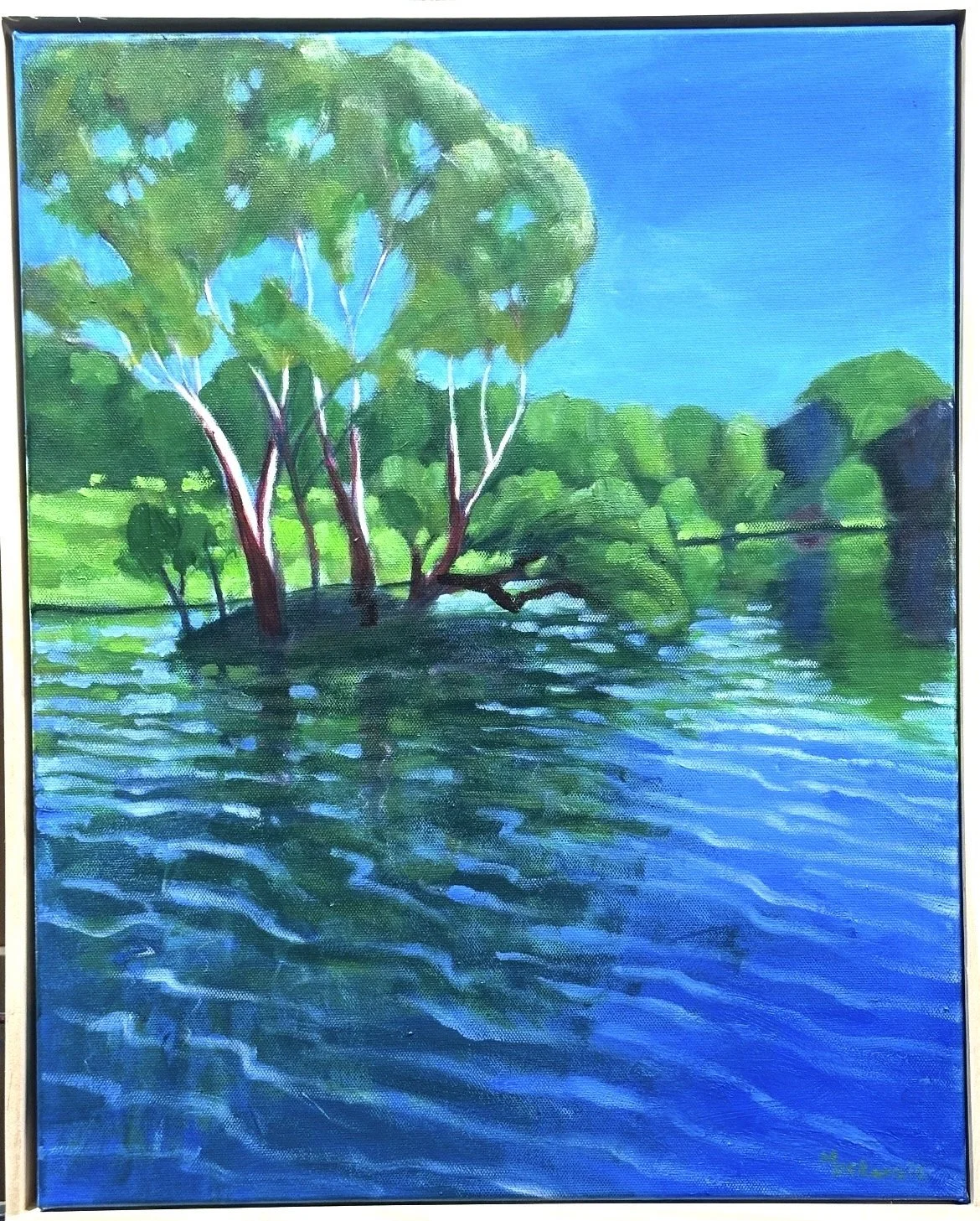 “Reflections on Victoria Park captures a quiet moment where water, light, and gum trees converge in a fragile balance. The mirrored surface suggests both presence and memory, evoking what is held within the landscape and what may be at risk of being lost. The work invites us to pause, reflect and protect this shared green refuge.”