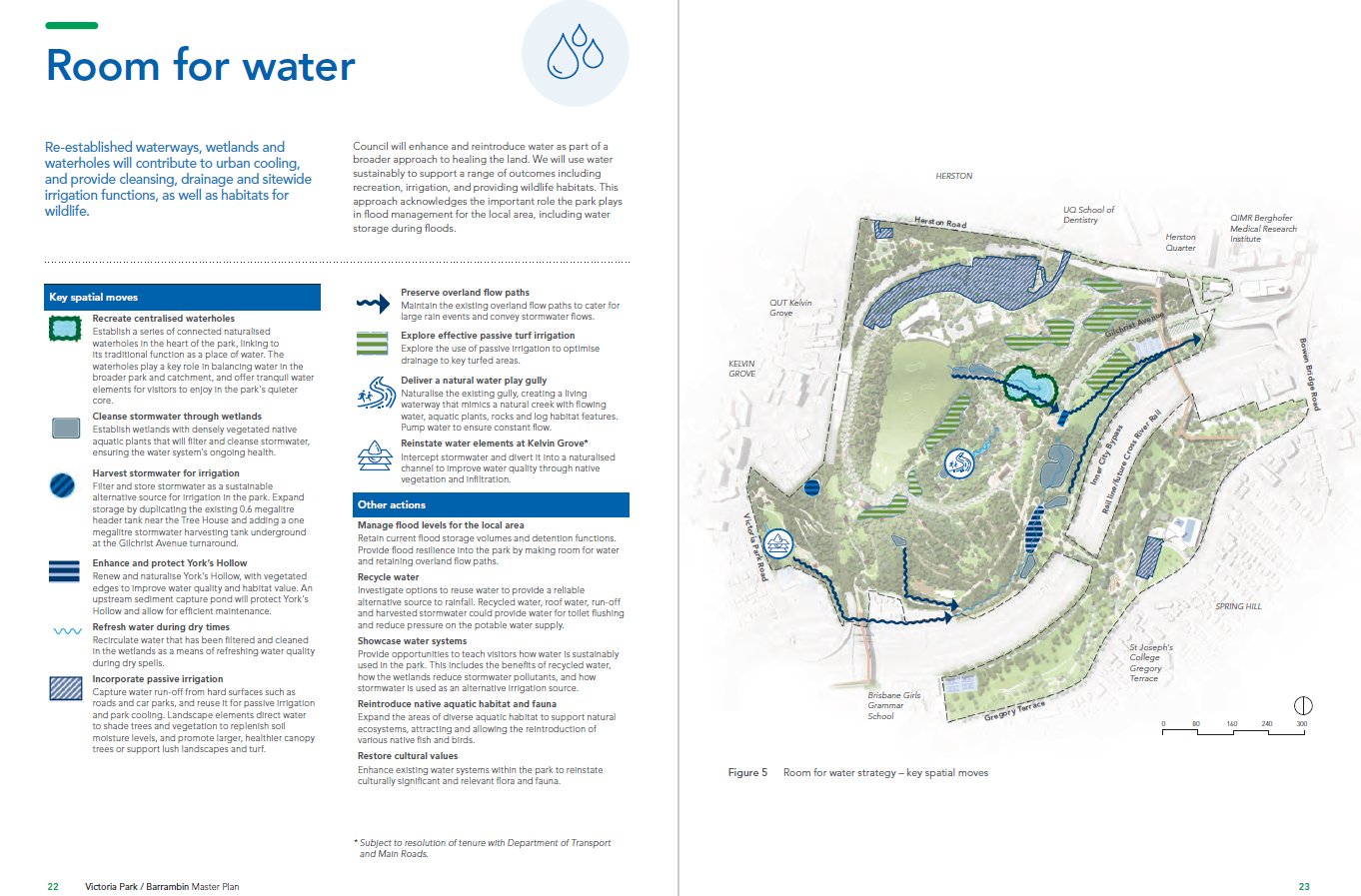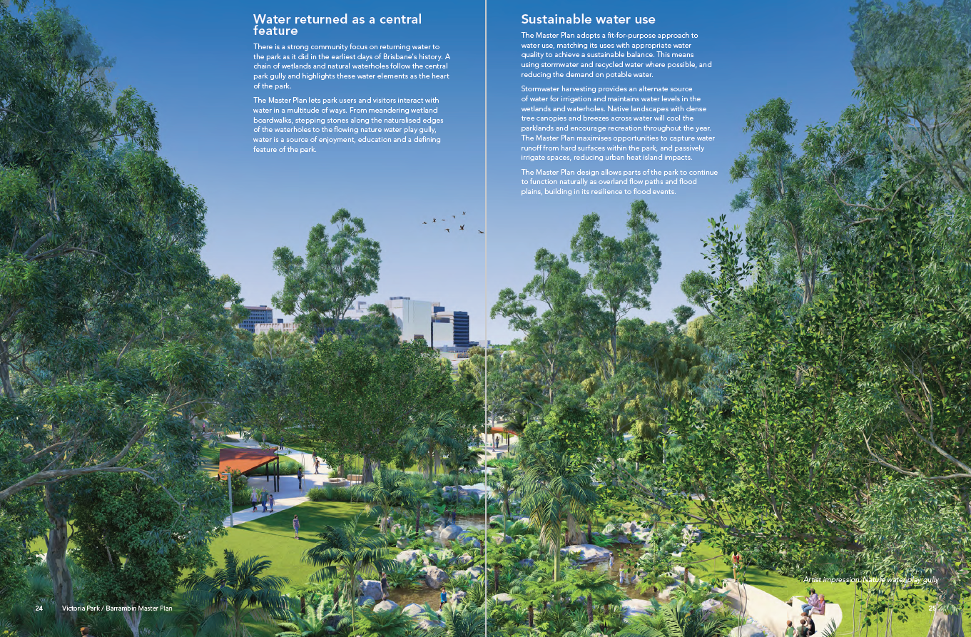 “There is a strong community focus on returning water to the park as it did in the earliest days of Brisbane's history. A chain of wetlands and natural waterholes follow the central park gully and highlights these water elements as the heart of the park” (Brisbane City Council Masterplan, 2023)