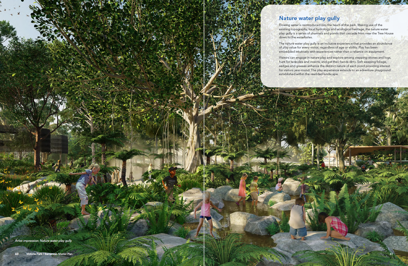 Water was central to that vision. The Masterplan recognised the site’s hydrological significance and proposed initiatives including a nature water-play gully and the restoration of York’s Hollow waterholes. Below are excerpts from the Masterplan that illustrate this focus.
