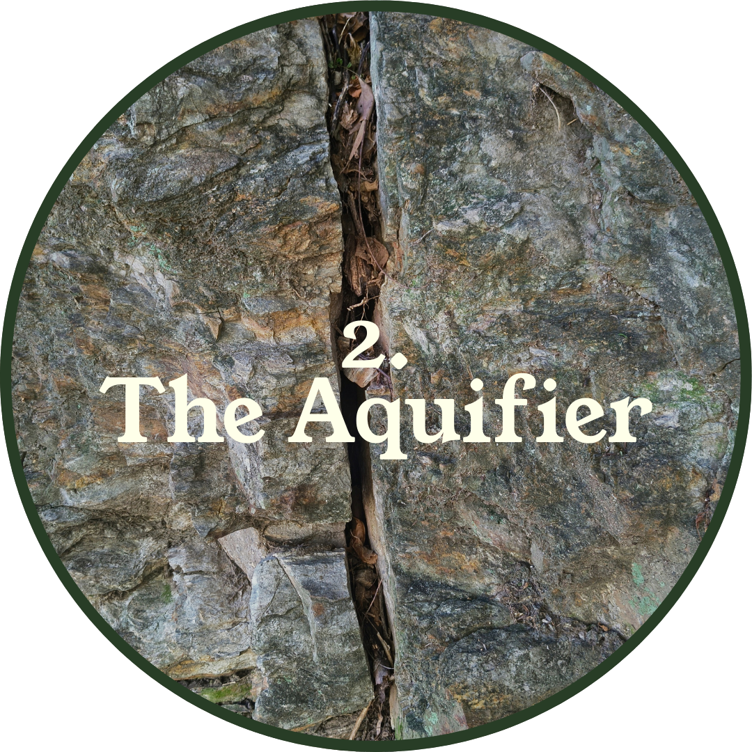 2. The aquifer, where that water is stored and filtered underground within soil and fractured rock. The water moves slowly through this rock, which is fractured like a network of tiny pathways. Water moves slowly through these cracks, sometimes taking days or weeks to travel downhill as clear flowing water.
